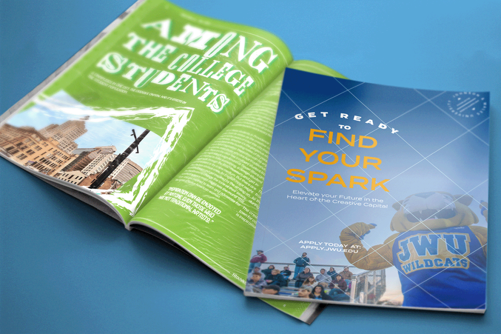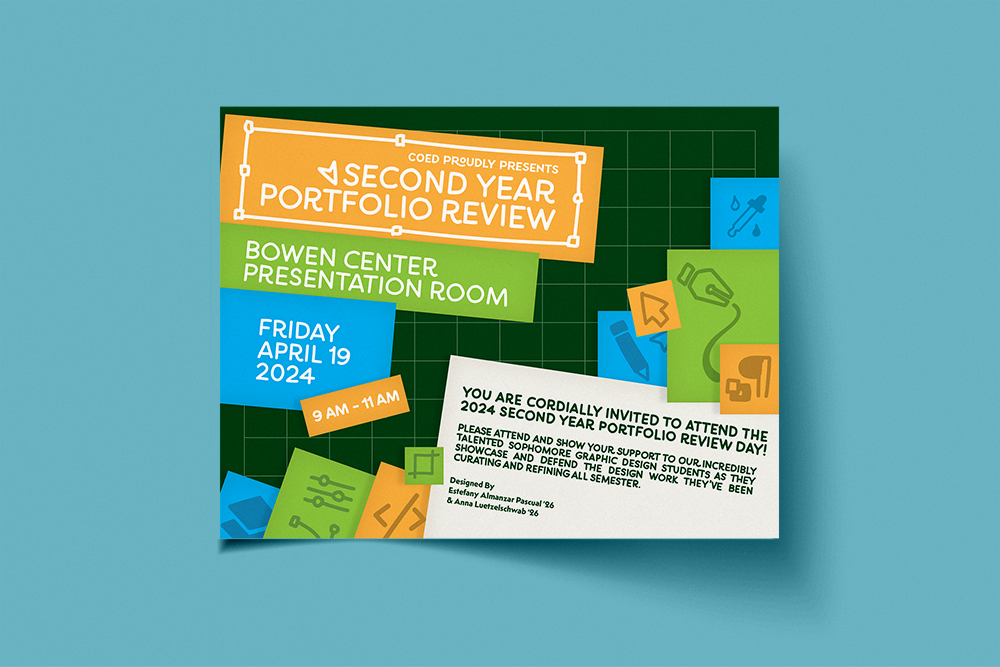 As Second Year Portfolio Review Day came closer, we were tasked with design an invitation flyer for the event. My design and my classmate Anna Luetzelschwab’s design were both chosen and our professor decided we should collaborate and unite our ideas. My idea was the Cutting Mat and paper and her idea was based around illustrations of things that represented the Graphic Design major. My layout and her amazing hand-lettering and illustrations made for a great invitation.