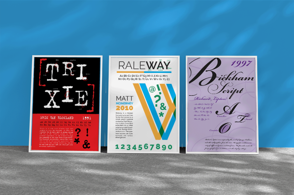 Immediately Raleway stuck out as the Sans-Serif font that I wanted to make a poster for. It is a super versatile font with multiple weights and one that can double as both a body copy and as a heading. It is also one of my favorite fonts (as seen in how often I use it). Trixie stood out to me because of the juxtaposition of it next to Raleway, they are vastly different fonts with completely different vibes. Bickham script fit right in as a third ‘individual’ in the set. The three fonts bring different things to the table and it was my goal to showcase that in my designs.