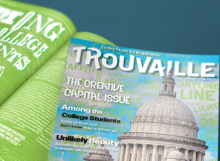 For the minizine, it was required to have an interview spread and an article spread. It all had to be original content so a portion of my time was spent writing the article and collecting responses to my interview questions. This issue of Trouvaille is all about Providence so I chose to write about all of the different colleges in Providence and how the art and inspiration sources throughout the city benefit all students even if they aren’t typical creatives. For my Interview, I asked 11 different designers about the things that inspired them in Providence.