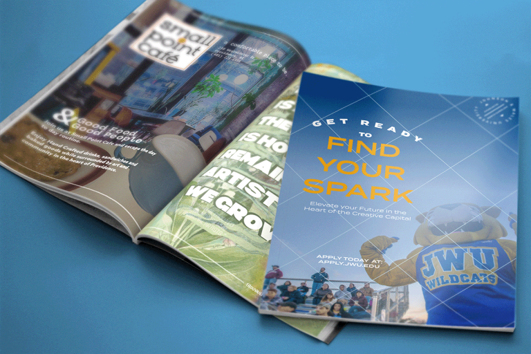 The final Minizine featured a print advertisement for Small Point cafe– a local cafe full of inspiration sources, a creative piece with a quote encouraging creatives to keep following their passions, and a full-page print ad promoting Johnson & Wales University to Creatives looking for a place to find their spark on the back cover. The creative piece featured a collaged background image and the Small Point cafe ad featured photographs from the inside of the cafe and of the food there. The JWU ad was made following the JWU brand guidelines but with a little ‘Trouvaille’ spark on the call to action.